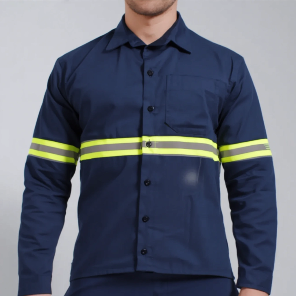 Camisa de Brim em Botões Reforçada com Faixa Refletiva Manga Longa Uniforme Profissional Rodovia